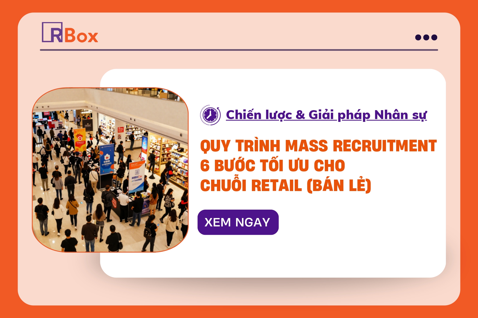 Bạn đang tìm kiếm một đối tác tuyển dụng có quy trình rõ ràng và hiệu quả? RBox tự hào giới thiệu Quy trình Mass Recruitment 6 bước chuẩn mực, được thiết kế để giải quyết mọi thách thức nhân sự cho ngành Retail. Từ thấu hiểu nhu cầu đến hỗ trợ ổn định sau